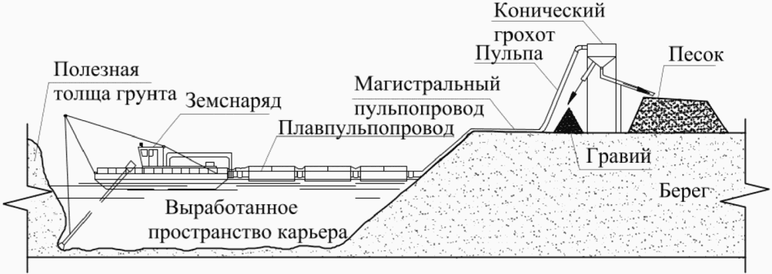 3.1.15 землесосный снаряд (земснаряд): Плавучая землеройная машина, разрабатывающая грунт из-под воды и перемещающая его вместе с водой по напорным пульпопроводам к месту намыва (укладки).