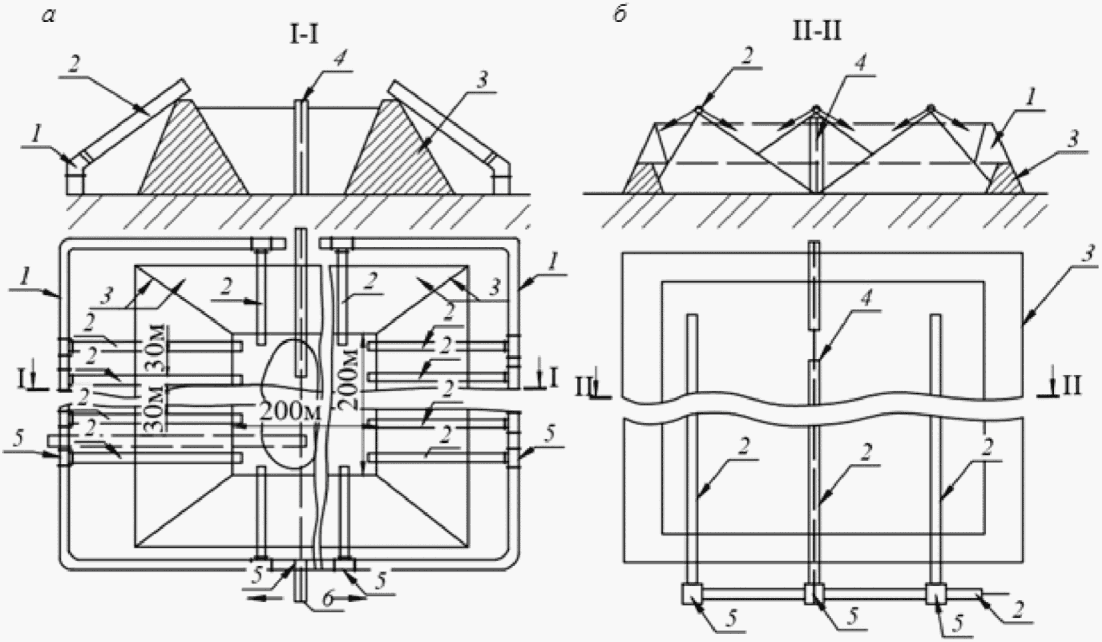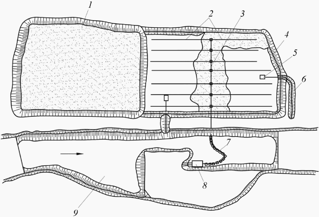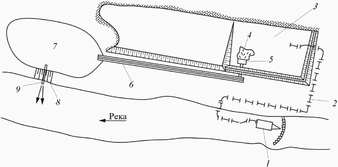 3.1.4 водосбросная система: Комплекс устройств для удаления осветленной воды с карты намыва, включающий водосбросной колодец и трубы, водоотводные и дренажные канавы, прудок-отстойник.
