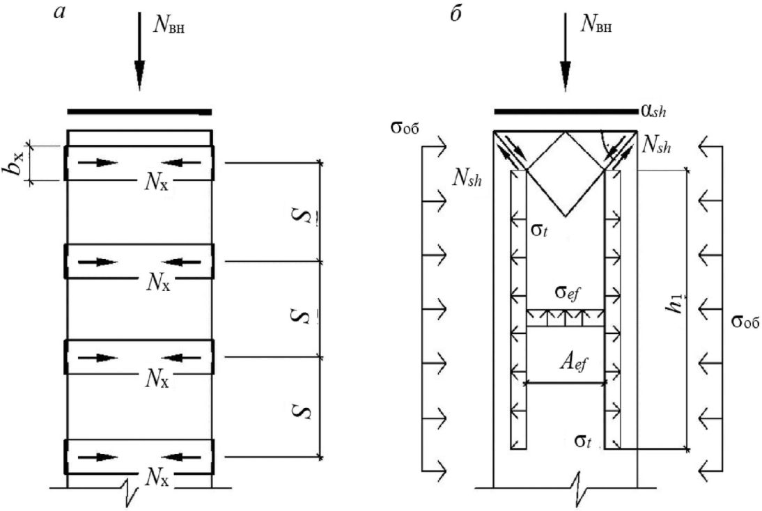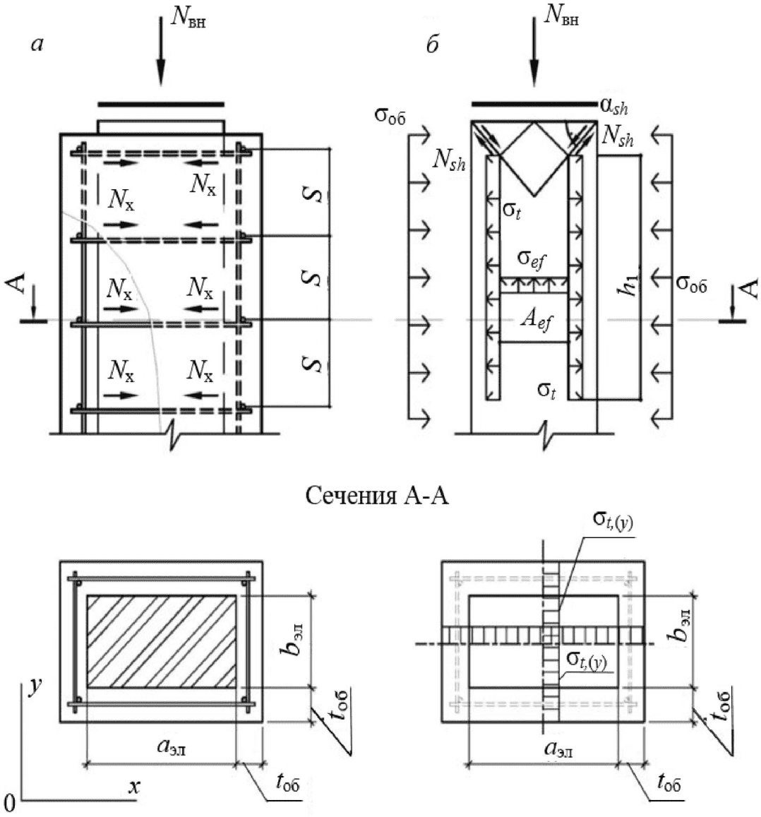 aэл, S - размер сечения сжатого элемента и шаг поясов обоймы по высоте.