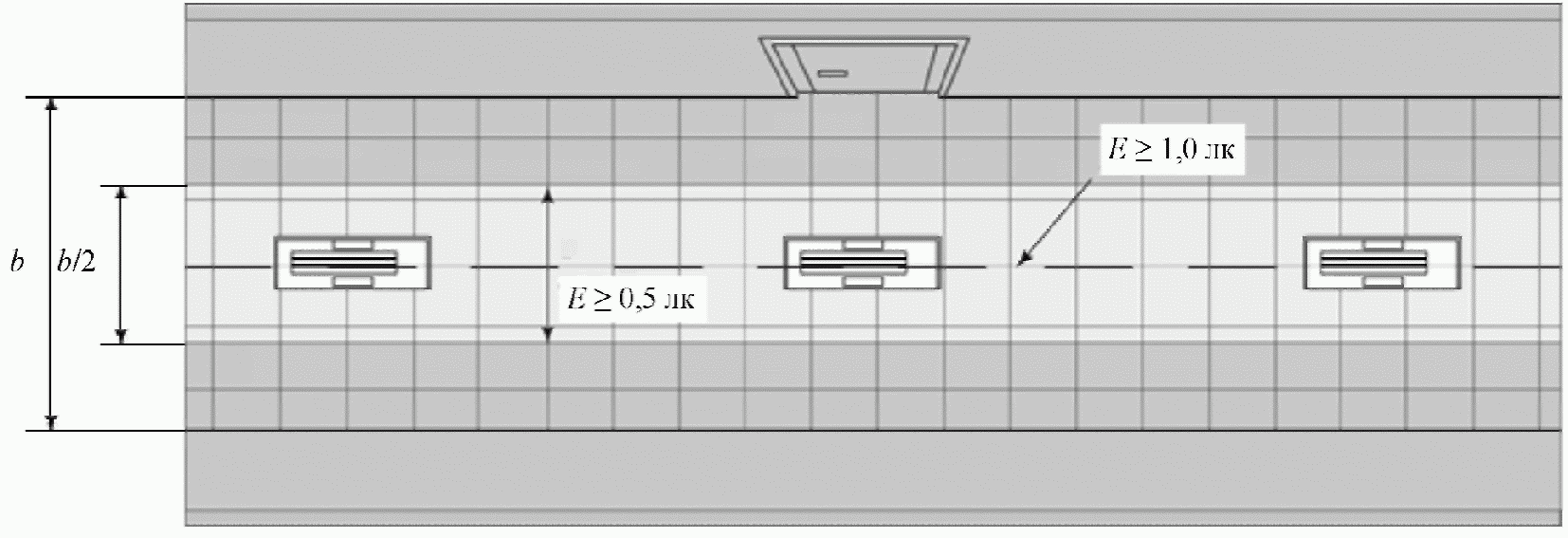 9.13.12 Освещение путей эвакуации от эвакуационного выхода из транспортной зоны тоннеля до зоны безопасности, включая соединительные проходы между тоннелями (сбойки), проходной (сервисный) тоннель для обслуживания инженерных систем тоннеля, галереи доступа аварийно-спасательных служб, должно обеспечивать минимальную освещенность не менее 0,5 лк при равномерности освещенности не менее 1:40.