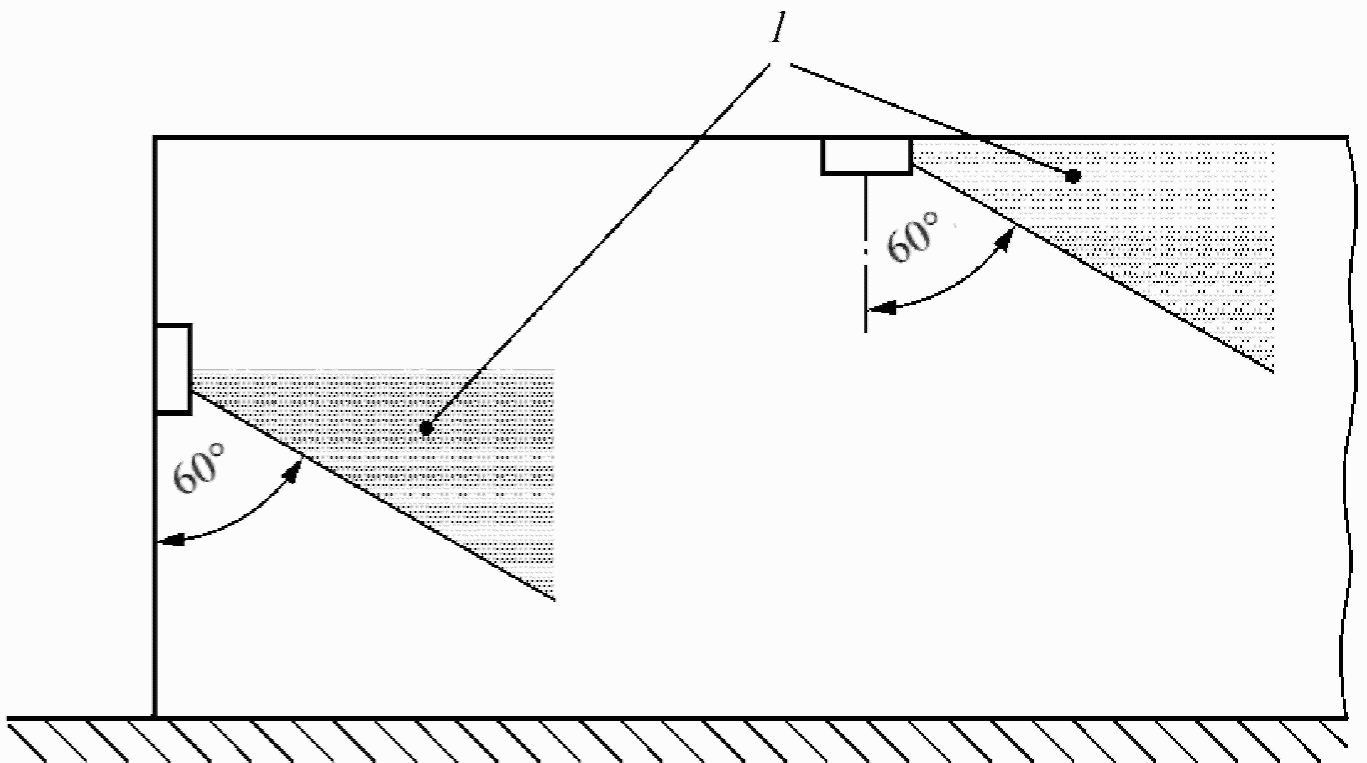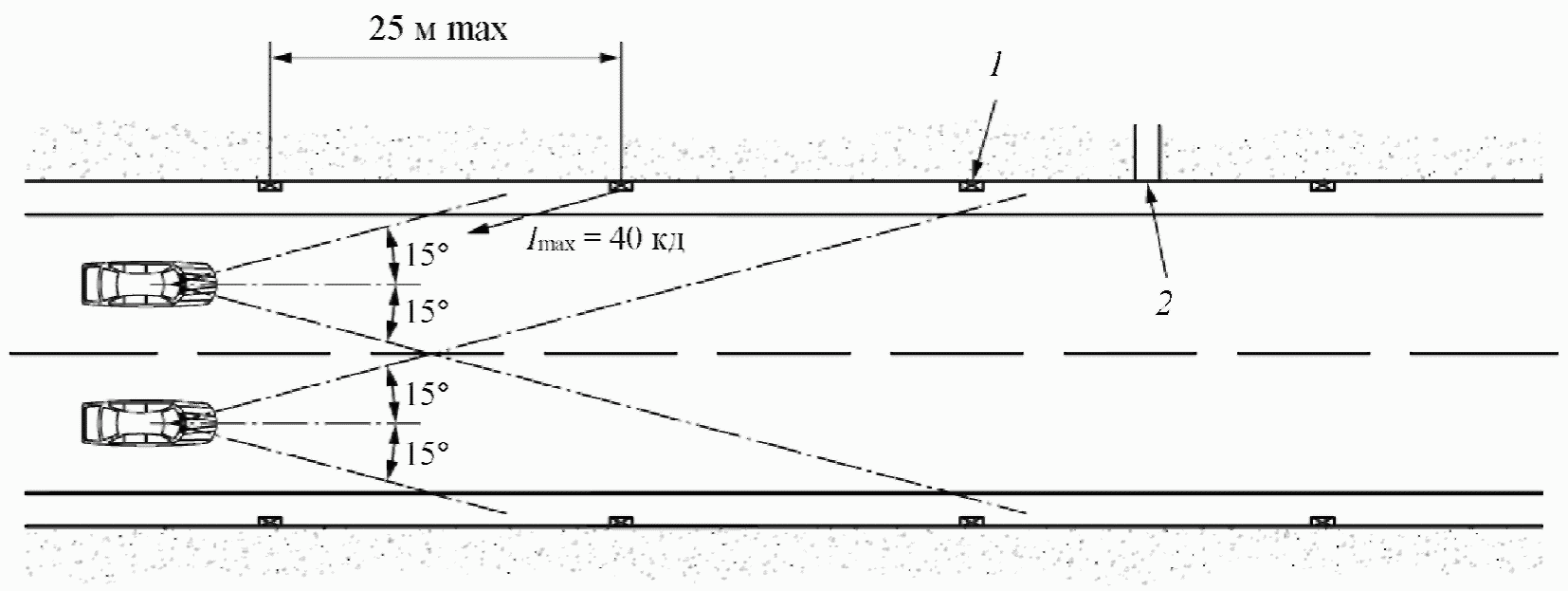9.13.8 Для предотвращения слепящего действия на водителя транспортного средства в нормальном режиме сила света указателей направления эвакуации, работающих в постоянном режиме, не должна превышать 40 кд в направлениях, по которым водитель видит эти приборы внутри конуса с раскрытием 2 x 15 относительно линии зрения. На рисунке 9.1 показаны в плане области ограничения силы света указателей направления эвакуации.