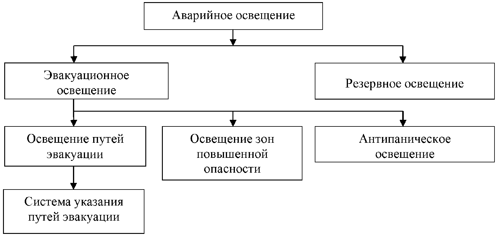 4.1 Аварийное освещение подразделяется на эвакуационное и резервное. Виды аварийного освещения представлены на рисунке 4.1.
