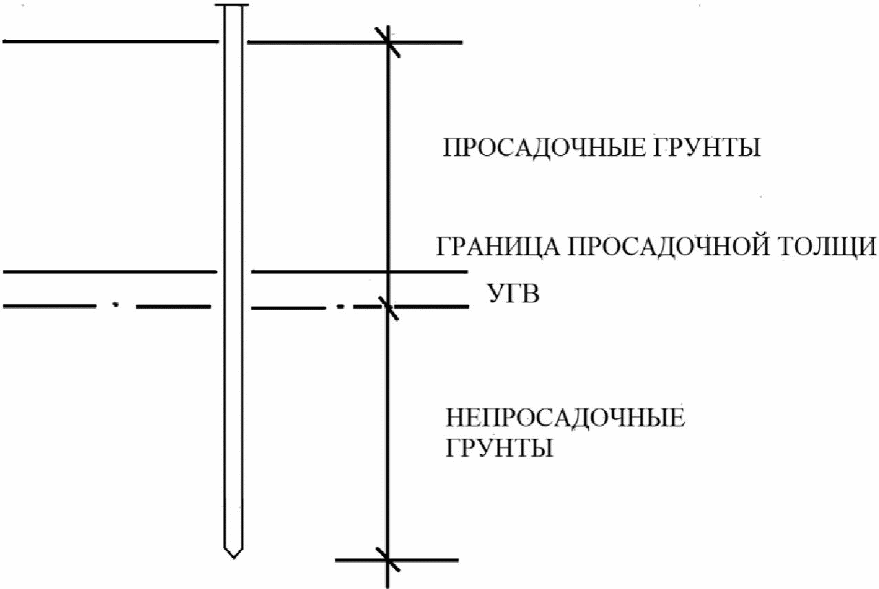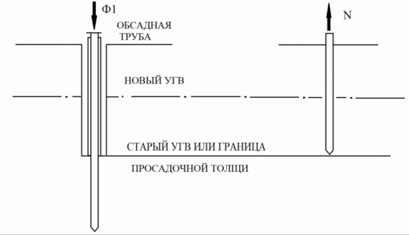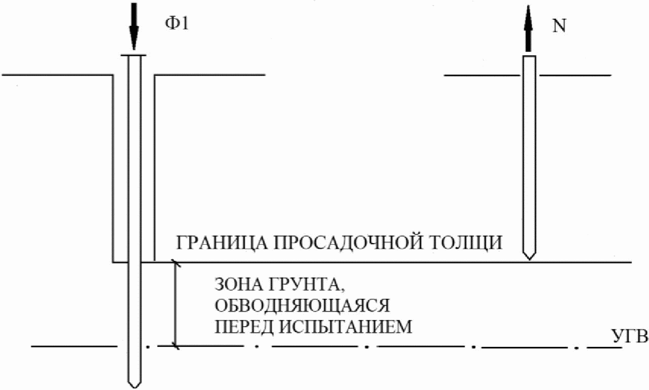 В тех случаях, когда до испытаний произошел быстрый подъем УГВ техногенного характера (в застроенных микрорайонах) и нет данных о прошедших просадочных процессах, испытания свай следует выполнять от ранее существовавшего УГВ или границы просадочной толщи по схеме, приведенной на рисунке Б.4.