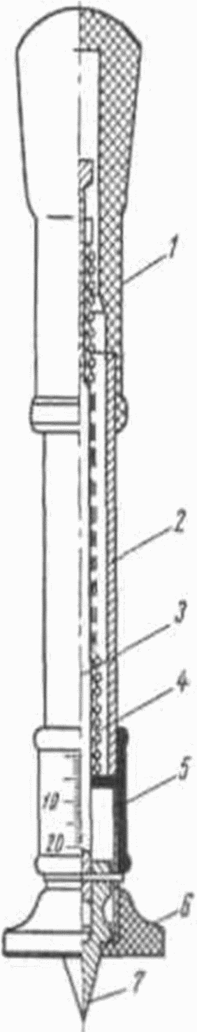 Принцип действия прибора основан на измерении глубины погружения подпружиненного конуса. При испытании определяют силу сопротивления грунта проникновению конуса. Пенетрация возможна только на высоту конуса. Схема микропенетрометра изображена на рисунке В.1.