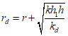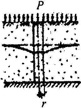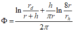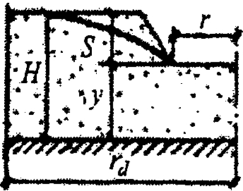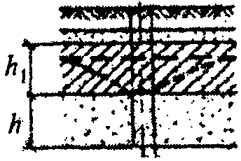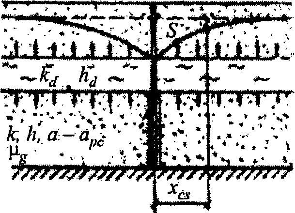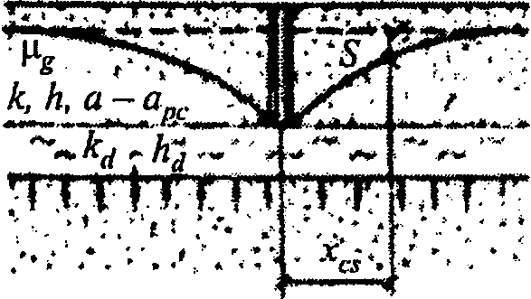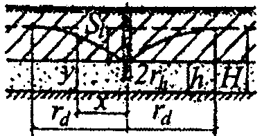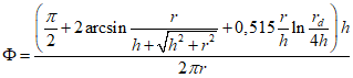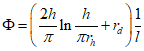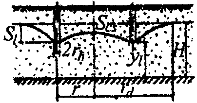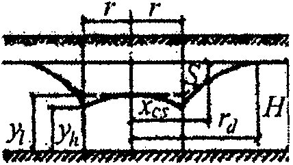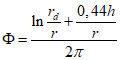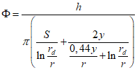 h - толщина водоносного слоя при напорной фильтрации или средняя высота потока (2H - S)/2 при безнапорной фильтрации, м;