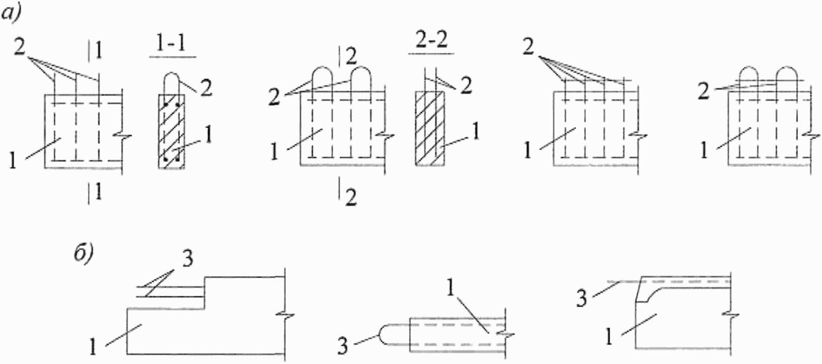 Выпуски арматуры, как правило, должны быть продолжением хомутов, поперечных стержней, сварных каркасов, продольной рабочей арматуры (рисунок 6.3). Чтобы не усложнять изготовление сборных элементов, целесообразно выпускать арматуру по возможности из свободных от опалубки поверхностей. Выпускаемые стержни должны быть с надежной анкеровкой в бетоне омоноличивания.