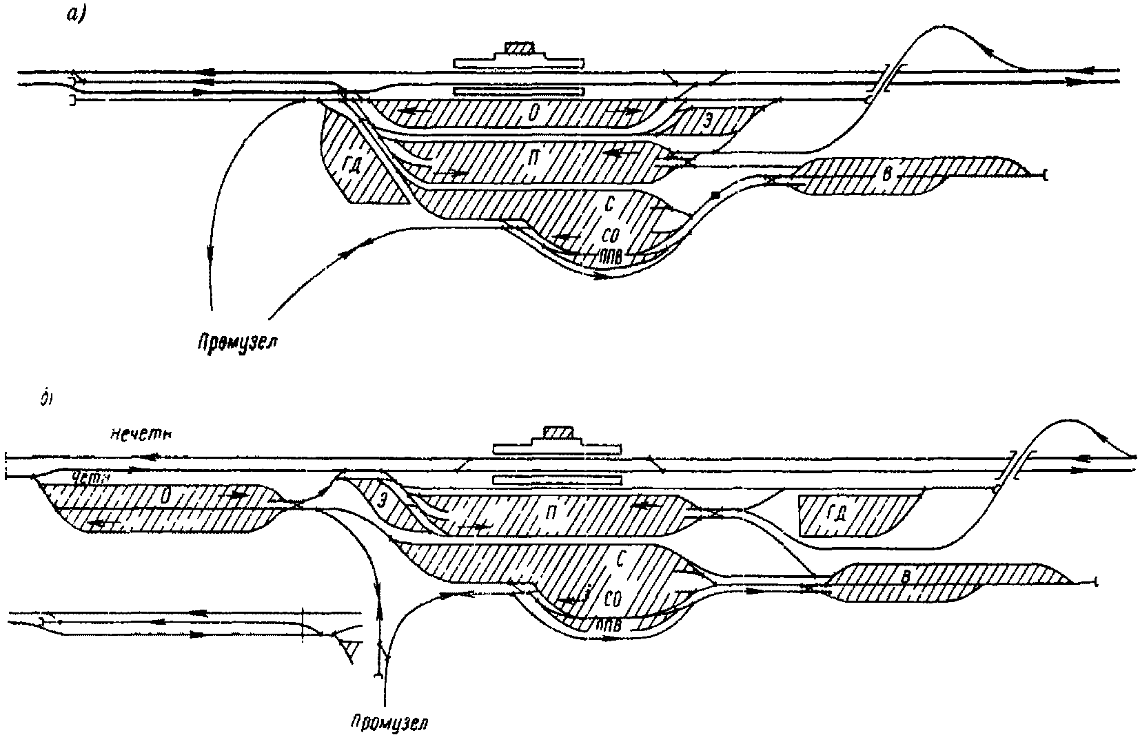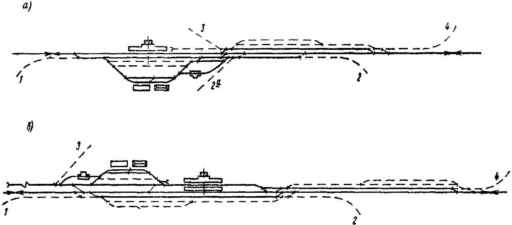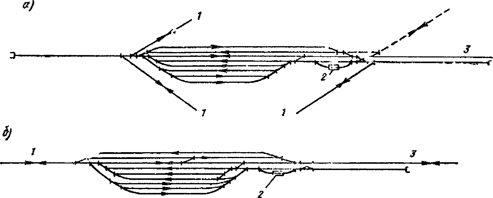 <*> Главные пути в приемо-отправочных парках станций промышленных предприятий выделяются только в случае пропуска через эти станции транзитных или пассажирских поездов, а также в случае отправления поездов своего формирования из сортировочного парка (при последовательном расположении парков).