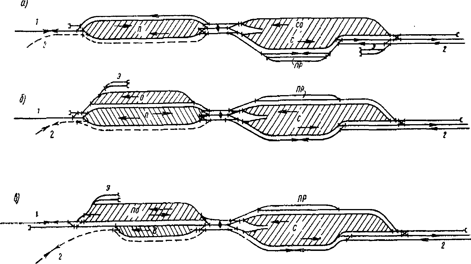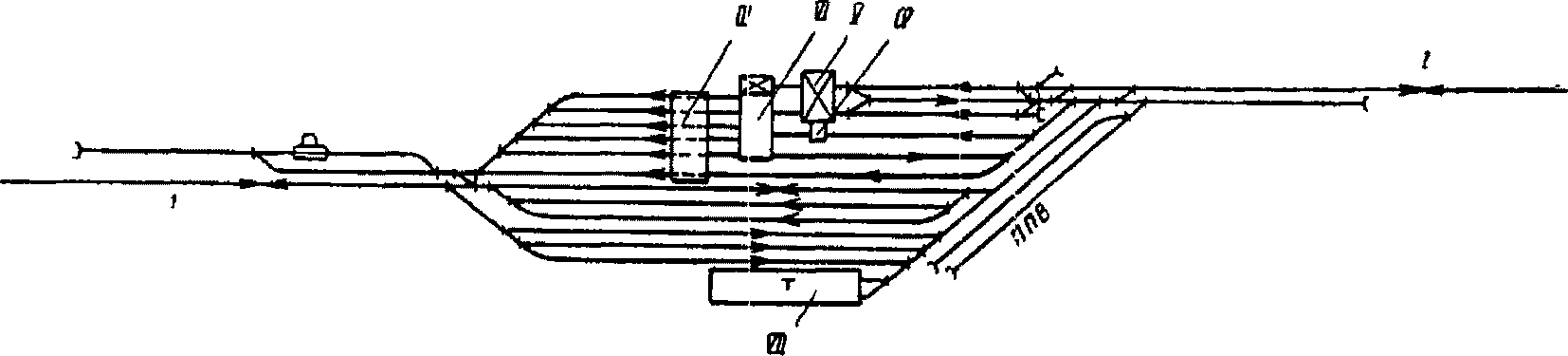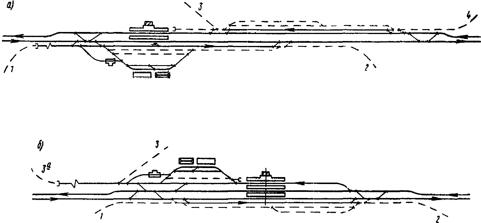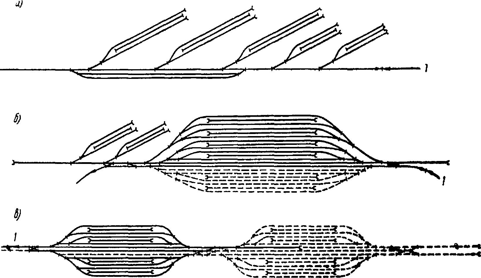 <*> Главные пути в приемо-отправочных парках станций промышленных предприятий выделяются только в случае пропуска через эти станции транзитных или пассажирских поездов, а также в случае отправления поездов своего формирования из сортировочного парка (при последовательном расположении парков).