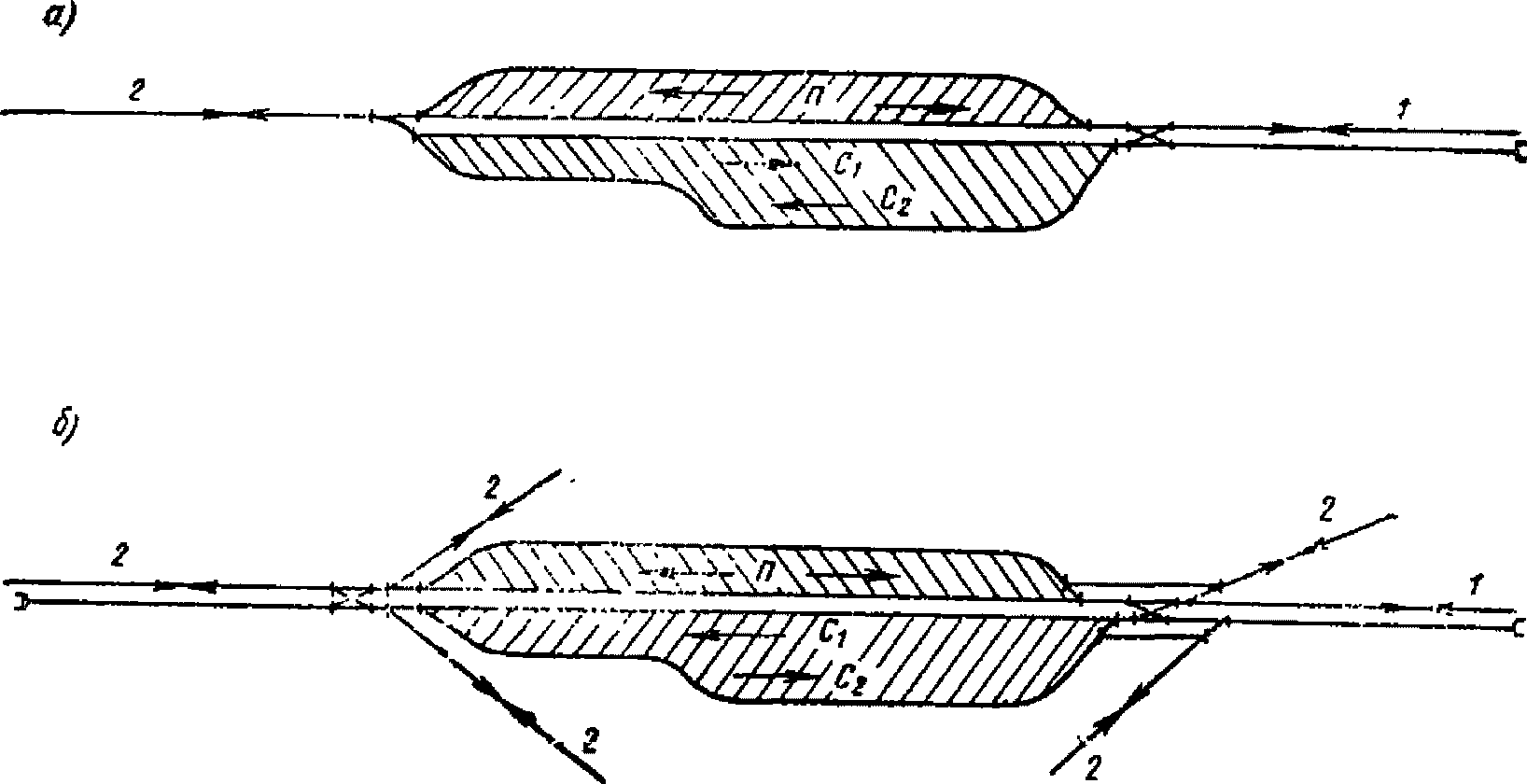 Если отправление поездов с путей сортировочного парка предусматривается с перестановкой в приемо-отправочный парк, то в голове сортировочного парка укладываются симметричные стрелочные переводы марки 1/6, предназначенные для горочных путей, а в месте примыкания обходного пути к горочной горловине должны укладываться симметричные стрелочные переводы марки 1/6, предназначенные для приемо-отправочных путей (см.