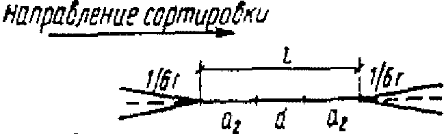 d, равной в нормальных условиях 6,25 м, а в стесненных условиях - 5,26 м исходя из условия, чтобы расстояние от оси стыка рамного рельса одного стрелочного перевода до начала остряка второго перевода было не менее 6 м. В голове сортировочного парка в этом случае рекомендуется укладывать стрелочные переводы марки 1/6, предназначенные для горочных путей (см.