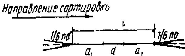 d не менее 6,25 м, а в стесненных условиях - не менее 4,5 м. При этом в голове сортировочных пучков, с путей которых намечается регулярное отправление поездов, должны быть уложены стрелочные переводы марки 1/6, предназначенные для приемо-отправочных путей.