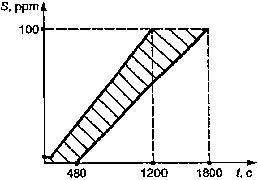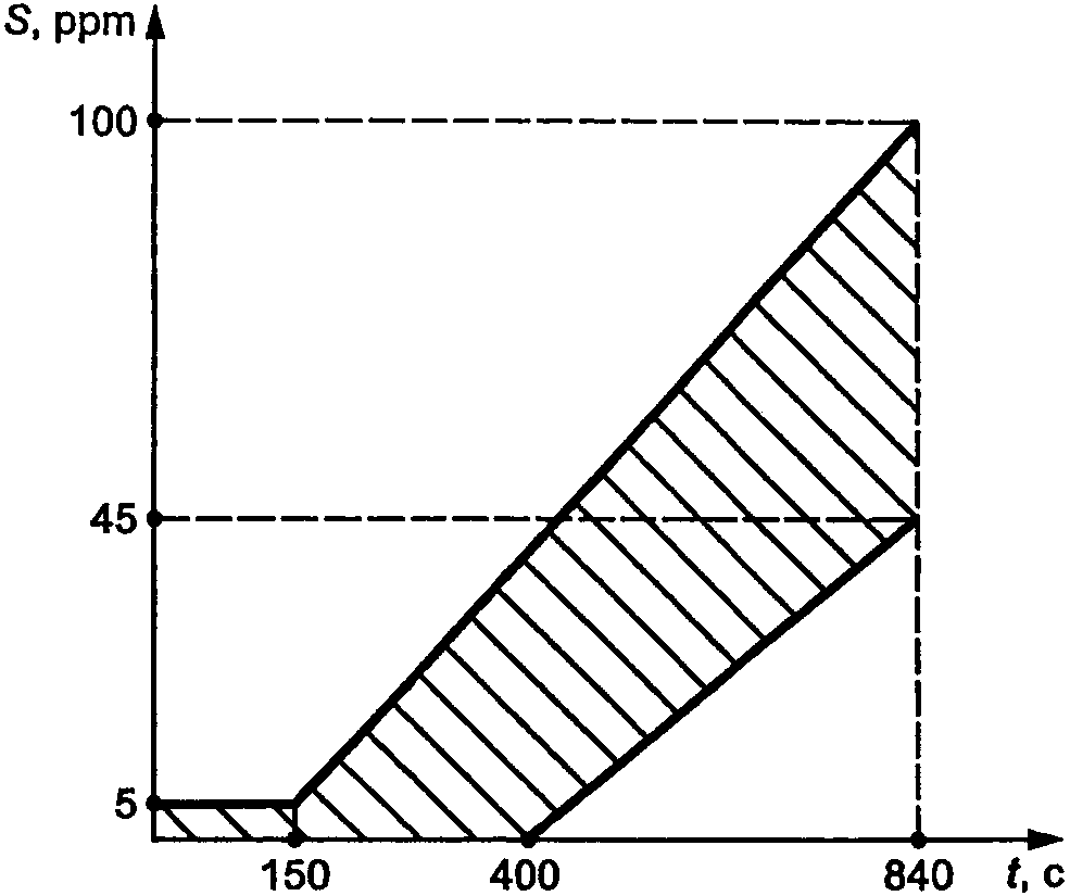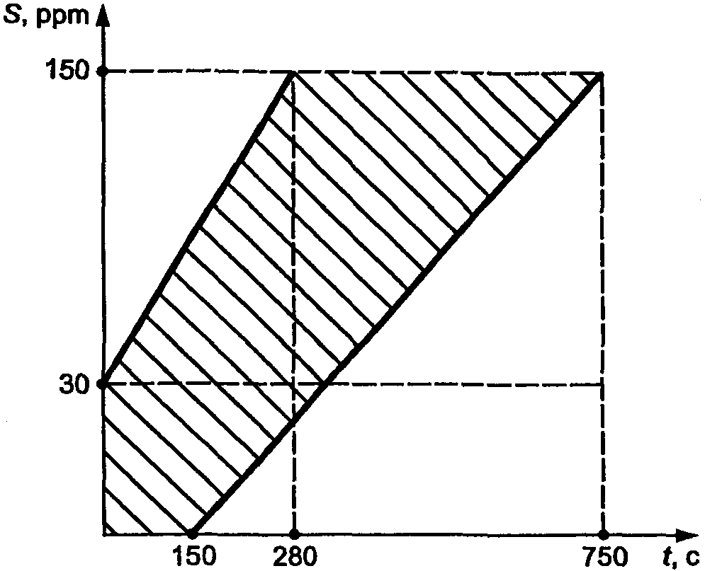 Изменение значения концентрации монооксида углерода в зависимости от значения удельной оптической плотности среды должно находиться в пределах диапазона, указанного на рисунке А.34. Изменение значения концентрации монооксида углерода в зависимости от времени проведения испытаний должно находиться в пределах диапазона, указанного на рисунке А.35.