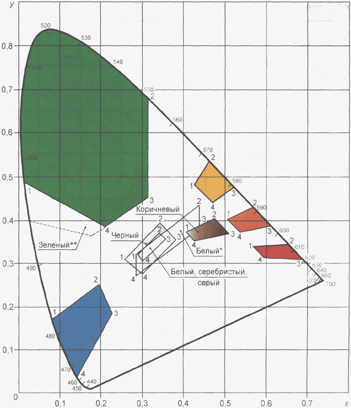 Цвет фона щита | Обозначение координат | Координаты цветности угловых точек цветовых областей |