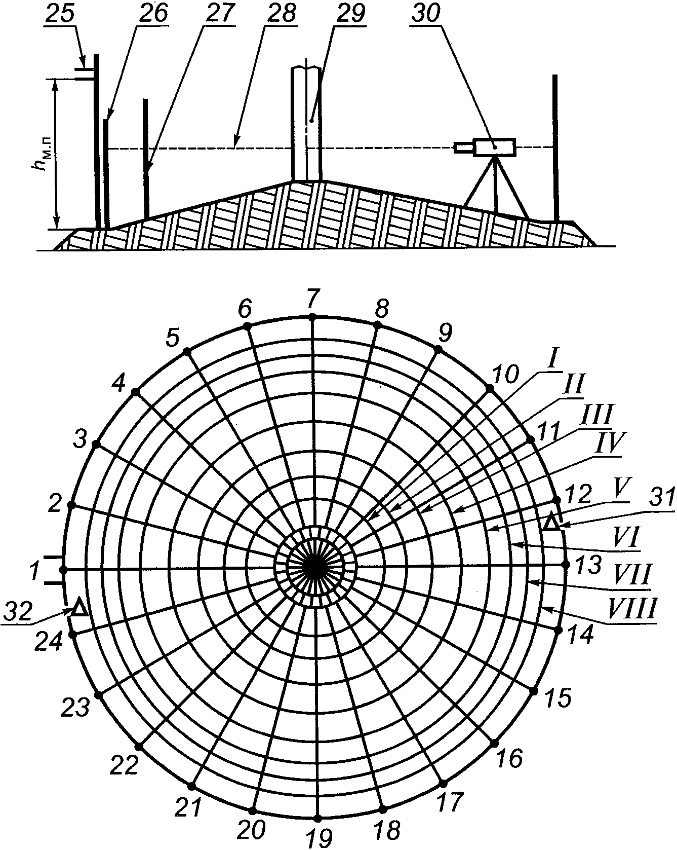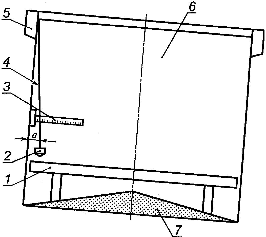 резервуара определяют по результатам измерений угла и направления наклона контура днища резервуара снаружи (или изнутри) с применением нивелира с рейкой.
