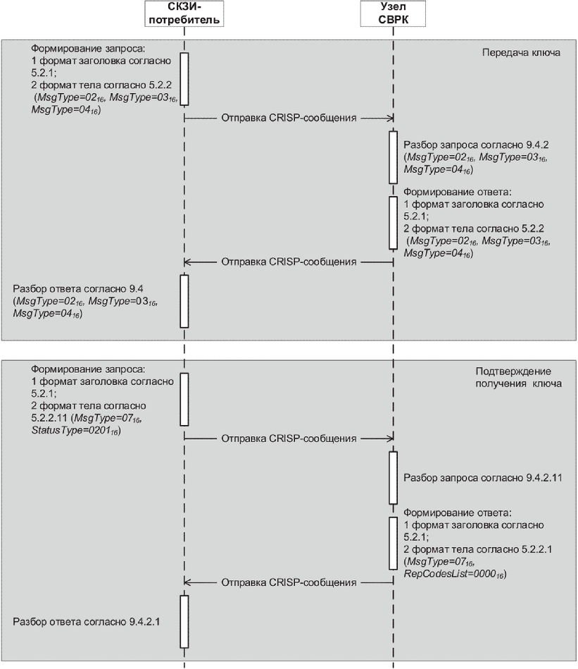В составе криптографически защищенных сообщений между узлом СВРК и СКЗИ-потребителем с помощью протокола могут передаваться секретные ключи, случайные числа и сервисная информация. При передаче ключей между узлом СВРК и СКЗИ-потребителем в сообщении для дополнительной защиты всегда формируется экспортное представление ключа: ключ передается внутри криптографически защищенного ключевого контейнера. Использование экспортного представления для случайных чисел является опциональным и определяется в зависимости от задач той системы, в которой реализуется протокол.