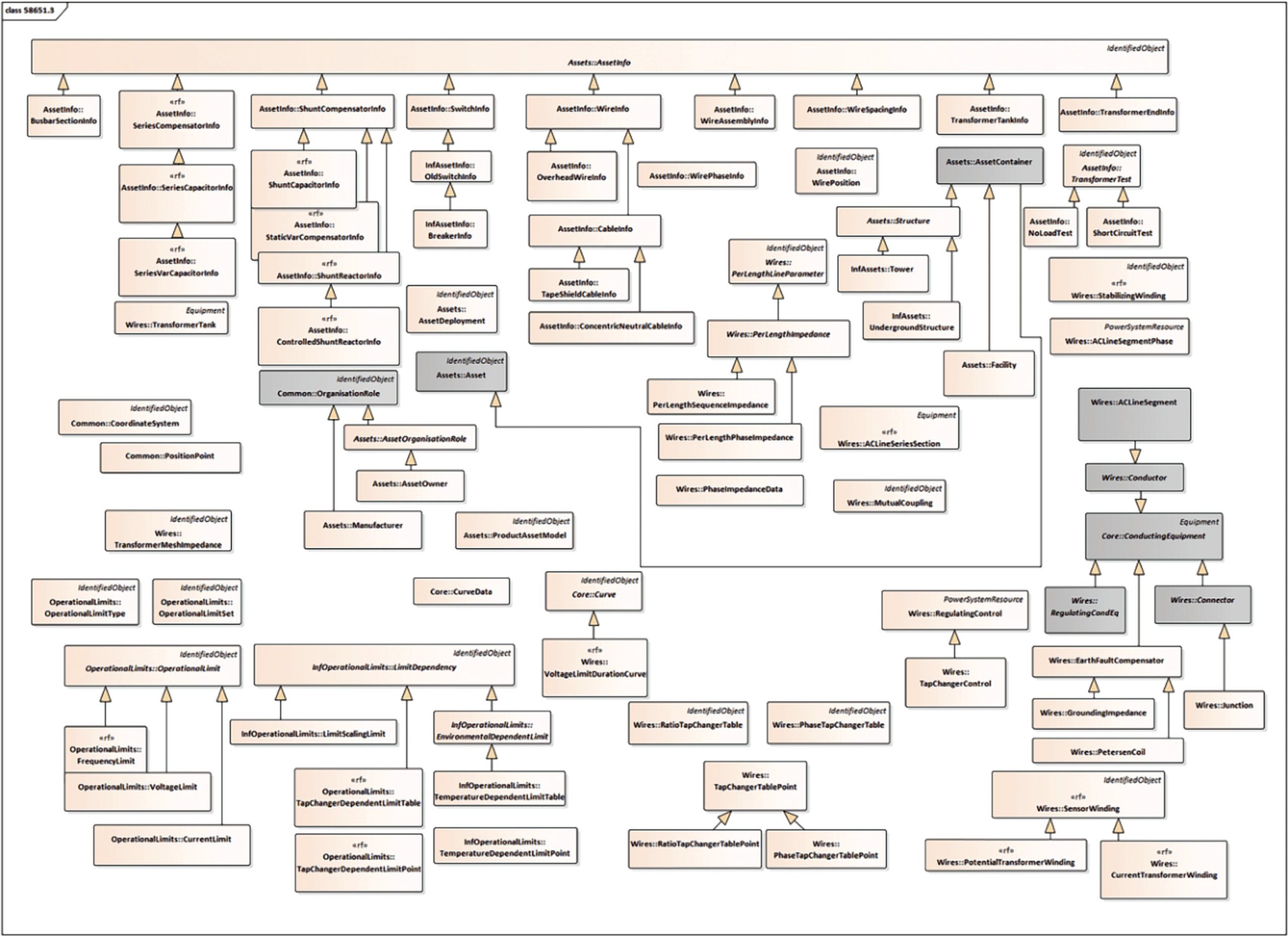 В первую очередь приводится(ятся) UML-диаграмма(ы) наследования классов соответствующего профиля информационной модели, включая родительские и определенные в других профилях информационной модели. При необходимости диаграмма наследования классов может быть разделена на несколько частей. Диаграмма наследования классов не включает описание атрибутов для представленных на ней классов, а также наименования ассоциаций.