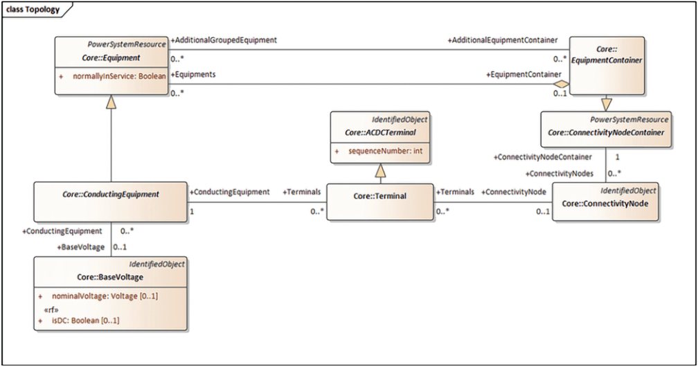 Топология описывается с использованием классов Terminal (полюс электропроводящего оборудования) и ConnectivityNode (соединительный узел). Каждая единица электропроводящего оборудования (ConductingEquipment) имеет от одного до нескольких полюсов.