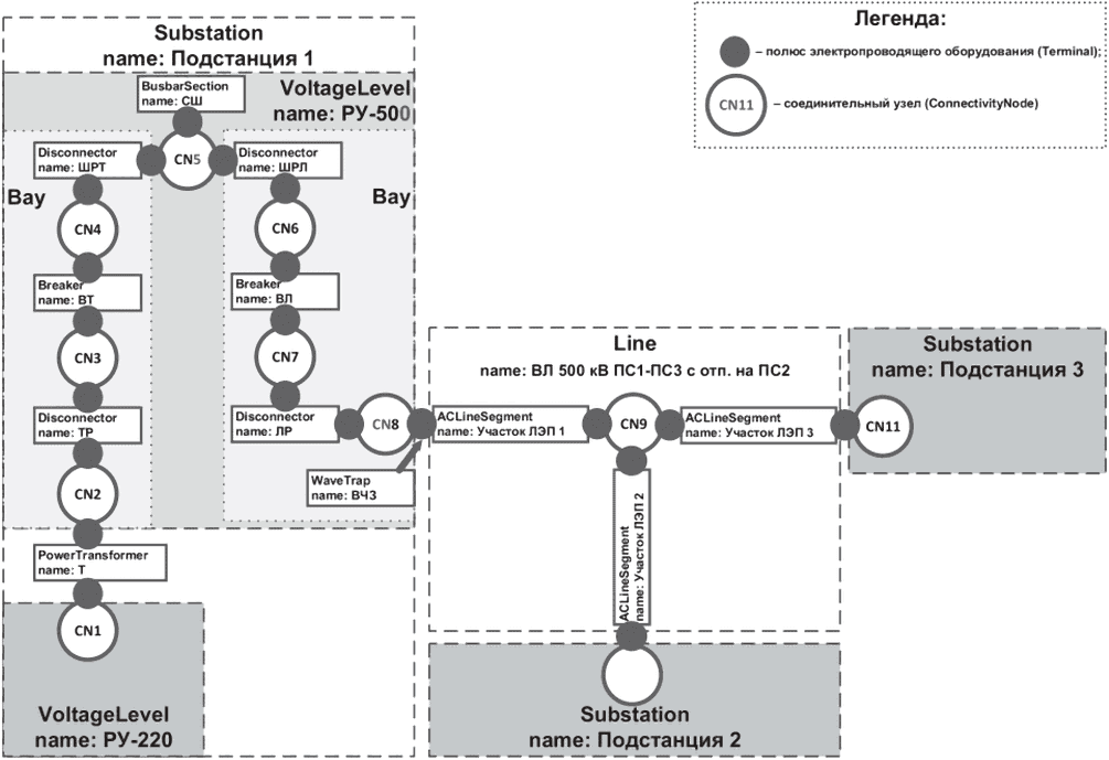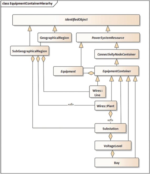 Каждый соединительный узел (ConnectivityNode) принадлежит контейнеру соединительных узлов (ConnectivityNodeContainer), а каждая единица оборудования принадлежит контейнеру оборудования (EquipmentContainer), унаследованному от контейнера соединительных узлов (ConnectivityNodeContainer).