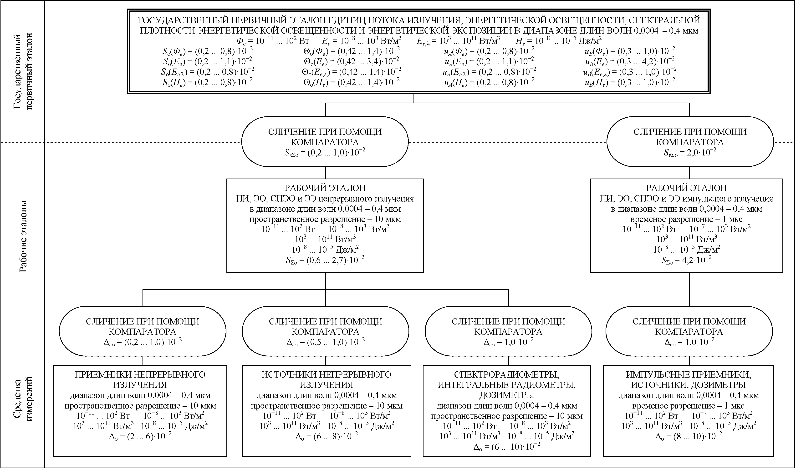 Графическая часть Государственной поверочной схемы для средств измерений потока излучения, энергетической освещенности, спектральной плотности энергетической освещенности и энергетической экспозиции в диапазоне длин волн от 0,0004 до 0,4 мкм представлена в