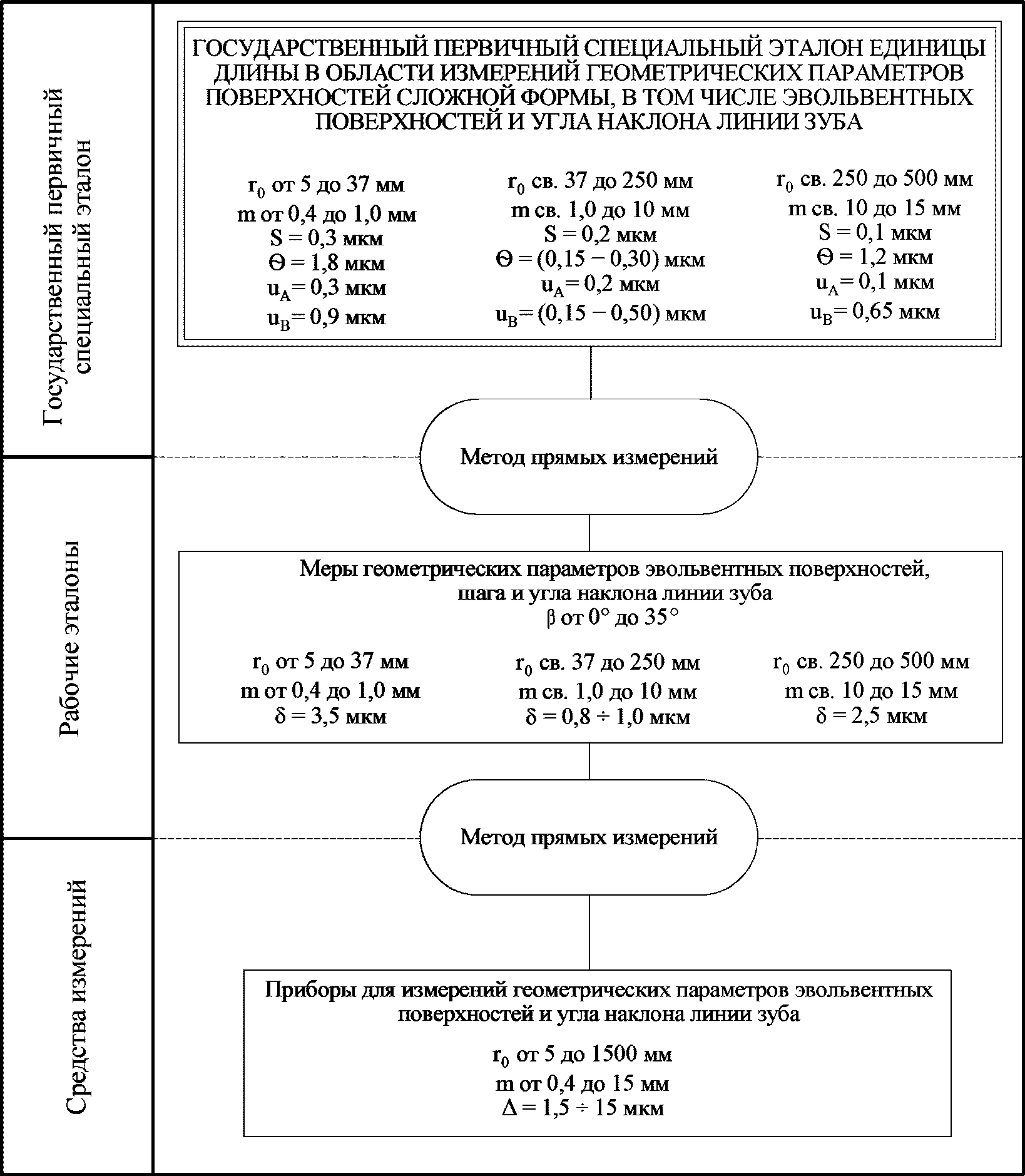 Допускается проводить передачу единицы длины в области измерений геометрических параметров поверхностей сложной формы, в том числе эвольвентных поверхностей и угла наклона линии зуба с использованием эталонов более высокой точности, чем предусмотрено настоящей государственной поверочной схемой.