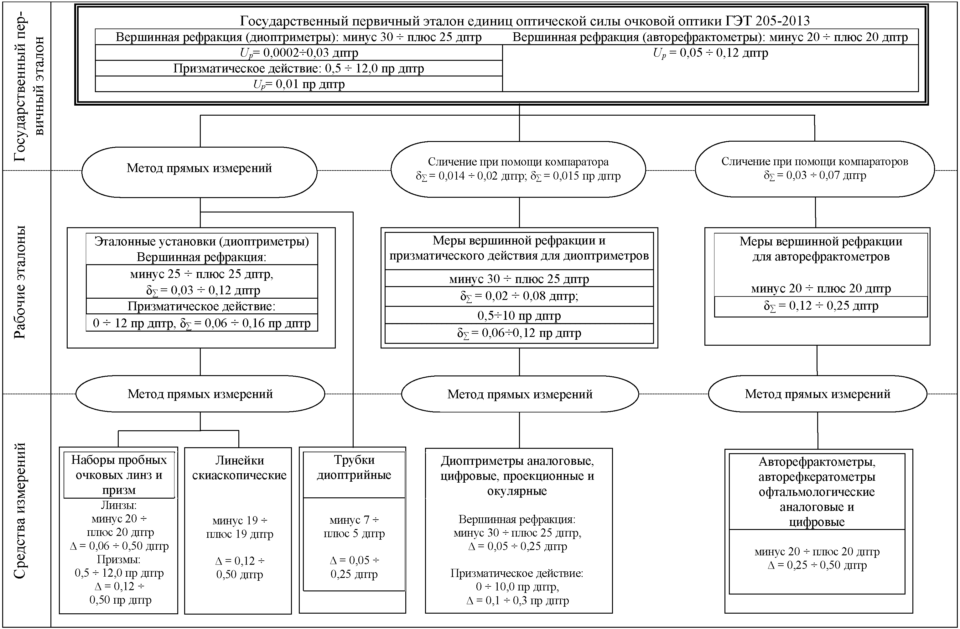 эталонные установки в виде цифровых диоптриметров, с диапазонами измерений вершинной рефракции от минус 25 до плюс 25 дптр, призматического действия от 0 до 12 пр дптр;