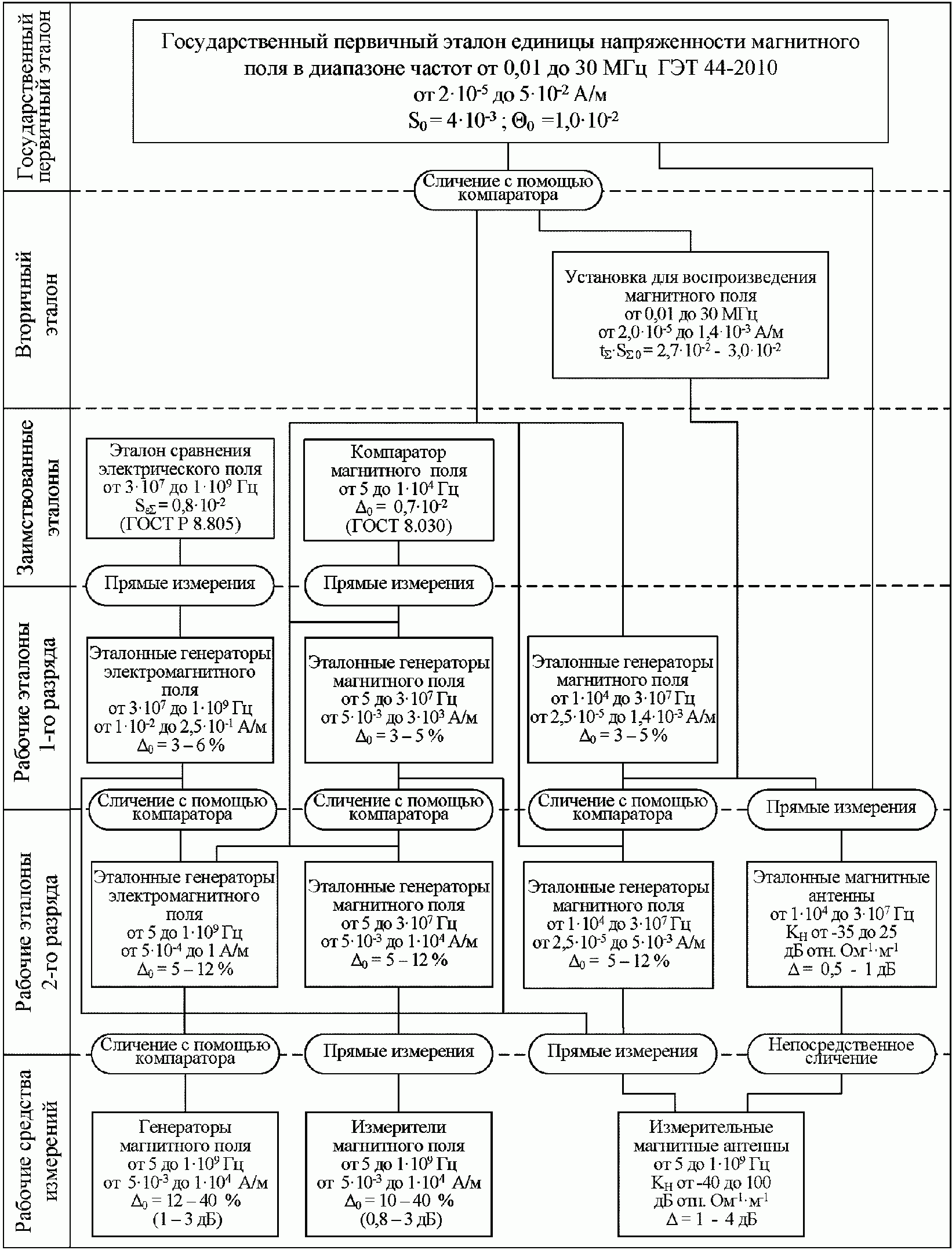 3.1. Государственный первичный эталон единицы напряженности магнитного поля в диапазоне частот от 0,01 до 30 МГц ГЭТ 44-2010 предназначен для воспроизведения методом образцового поля, хранения и передачи единицы напряженности магнитного поля с гармонической временной зависимостью в диапазоне частот 0,01 - 30 МГц. Передача размера единицы напряженности магнитного поля вторичным эталонам, рабочим эталонам 1-го и 2-го разрядов осуществляется методами сличения с помощью компаратора и прямых измерений.