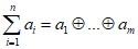 | - битовая строка, являющаяся результатом покомпонентного сложения по модулю 2 битовых строк одинаковой длины. Суммой строк a1,..., am называется строка  ; |