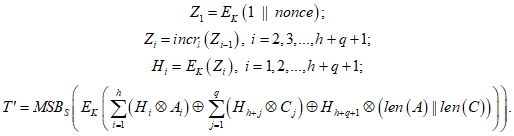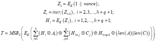 Б.2.3 Выработка значения имитовставки T от дополнительных имитозащищаемых данных A и шифртекста C происходит следующим образом: