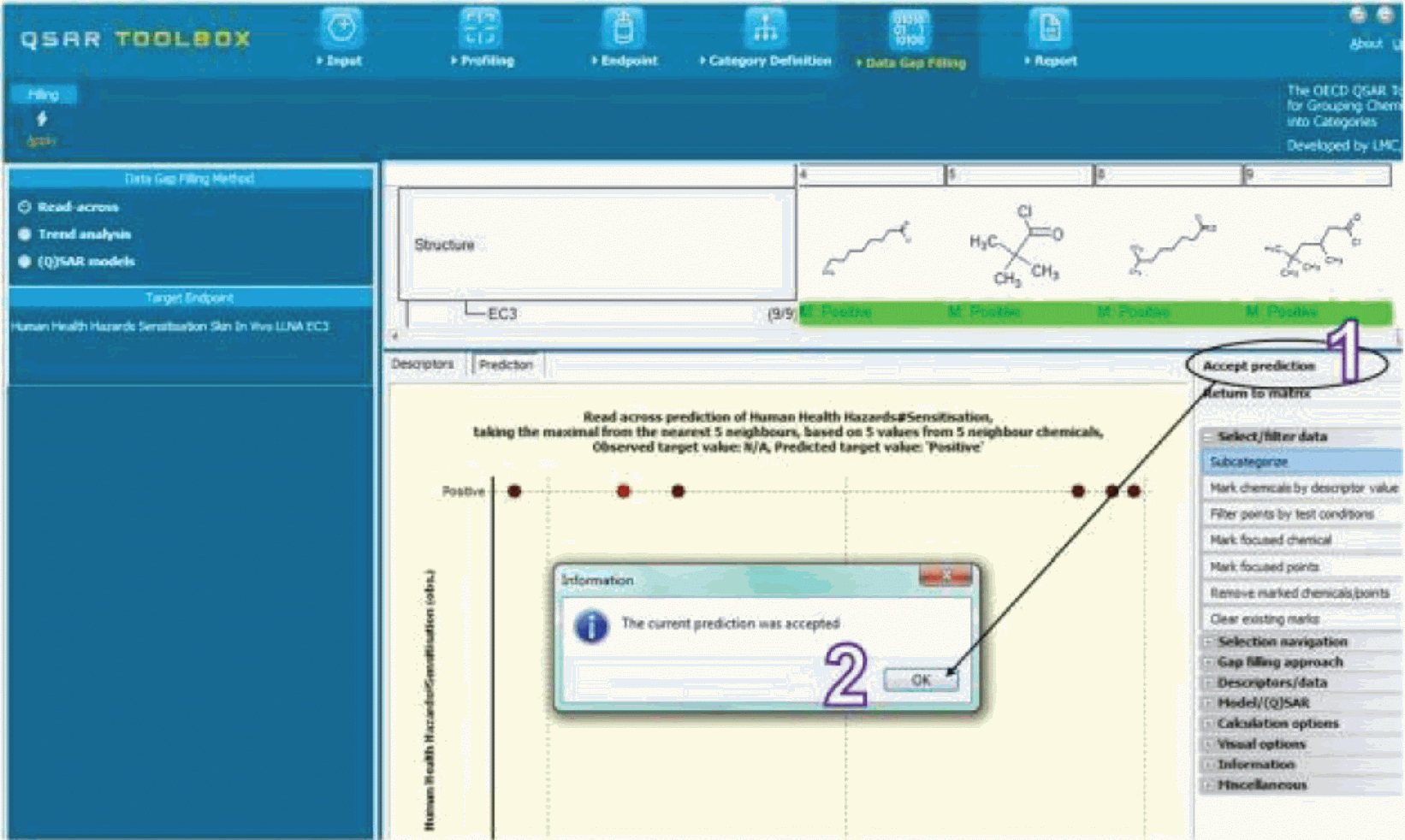 Подтвердив, что аналоговый подход достаточно надежный как с точки зрения предполагаемых механизмов химических превращений, так и с точки зрения структурного сходства, расчетные данные можно принять, нажав на кнопку "Accept prediction" ("Принять расчетные данные") 1 и нажав кнопку "OK" ("Принять") 2, в результате чего результат появится в матрице данных (рисунок 27).