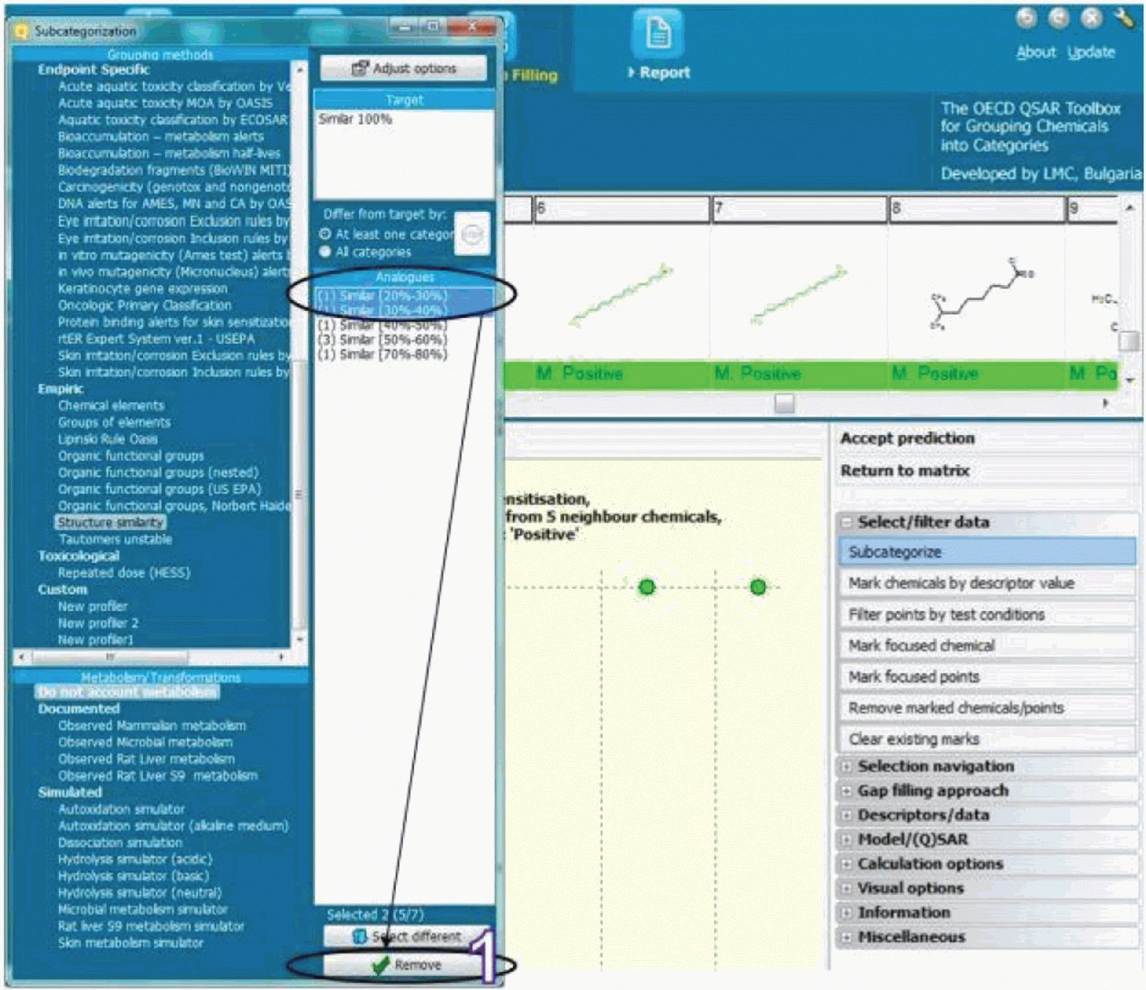 В данном примере имеется только одно химическое вещество, которое имеет очень высокое структурное сходство с рассматриваемым соединением. На данном этапе необходимо решить, сохранить ли только этот аналог только для метода аналогий или сохранить также и другие аналоги (рисунок 26). Нажатием кнопки "Remove" ("Удалить") 1 можно убрать не подходящие для рассмотрения аналоги.