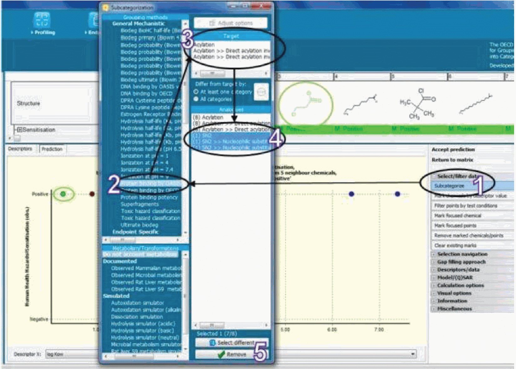 Для того чтобы это проверить, необходимо открыть меню "Select/Filter Data" ("Выбрать/Фильтровать данные") и перепрофилировать список идентифицированных аналогов, нажав кнопку "Subcategorize" ("Подкатегория") 1, и выбрать метод группировки "Protein Binding by OASIS v.1.1" 2. Затем свойства аналогов сравниваются со свойствами рассматриваемого вещества 3. Как видно на рисунке 24, существует один аналог, отличающийся от рассматриваемого механизма связывания белка 4. Для удаления неподходящего вещества необходимо нажать кнопку "Remove" ("Удалить") 5.