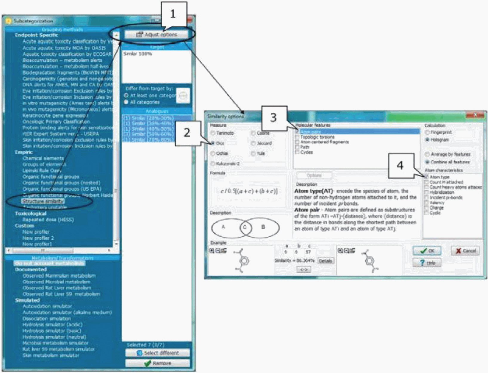 Настроить параметры подобия возможно при нажатии на кнопку "Adjust" ("Установить") 1, после чего необходимо использовать метод Dice 2, выбрать атомарные пары "Atom pairs" ("Атомные пары") 3, исходя из определенных молекулярных свойств, и указать тип атома "Atom type" ("Тип атома") 4, исходя из его характеристичных свойств (рисунок 25).