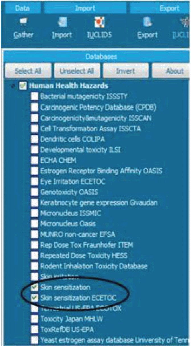 рисунке 16). Например, если выбраны только базы данных по сенсибилизации кожи "Skin sensitisation ECETOC" и "Skin sensitisation", аналоговый поиск будет проводиться только среди тех химических веществ, для которых имеются экспериментальные данные о сенсибилизации кожи в указанных базах данных.