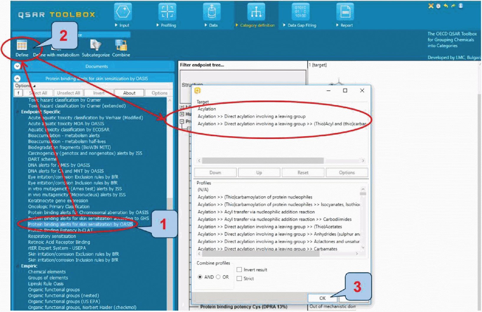 Результат профилирования определяет наиболее подходящий способ поиска аналогов. Наиболее значимым профилем для рассмотрения сенсибилизации кожи является "Связывание с белками". Результаты профилирования (раздел 5) показали, что рассматриваемое вещество может связываться с белком по определенному механизму (нуклеофильное замещение в галоидангидриде карбоновой кислоты). Поэтому наиболее подходящим способом дальнейших действий является поиск химических веществ, которые могут связываться с белками по тому же механизму и для которых имеются экспериментальные результаты по сенсибилизации. Как видно в разделе 6, соответствующие базы данных выбирают по сенсибилизации "Skin sensitisation ECETOC" и "Skin sensitisation".