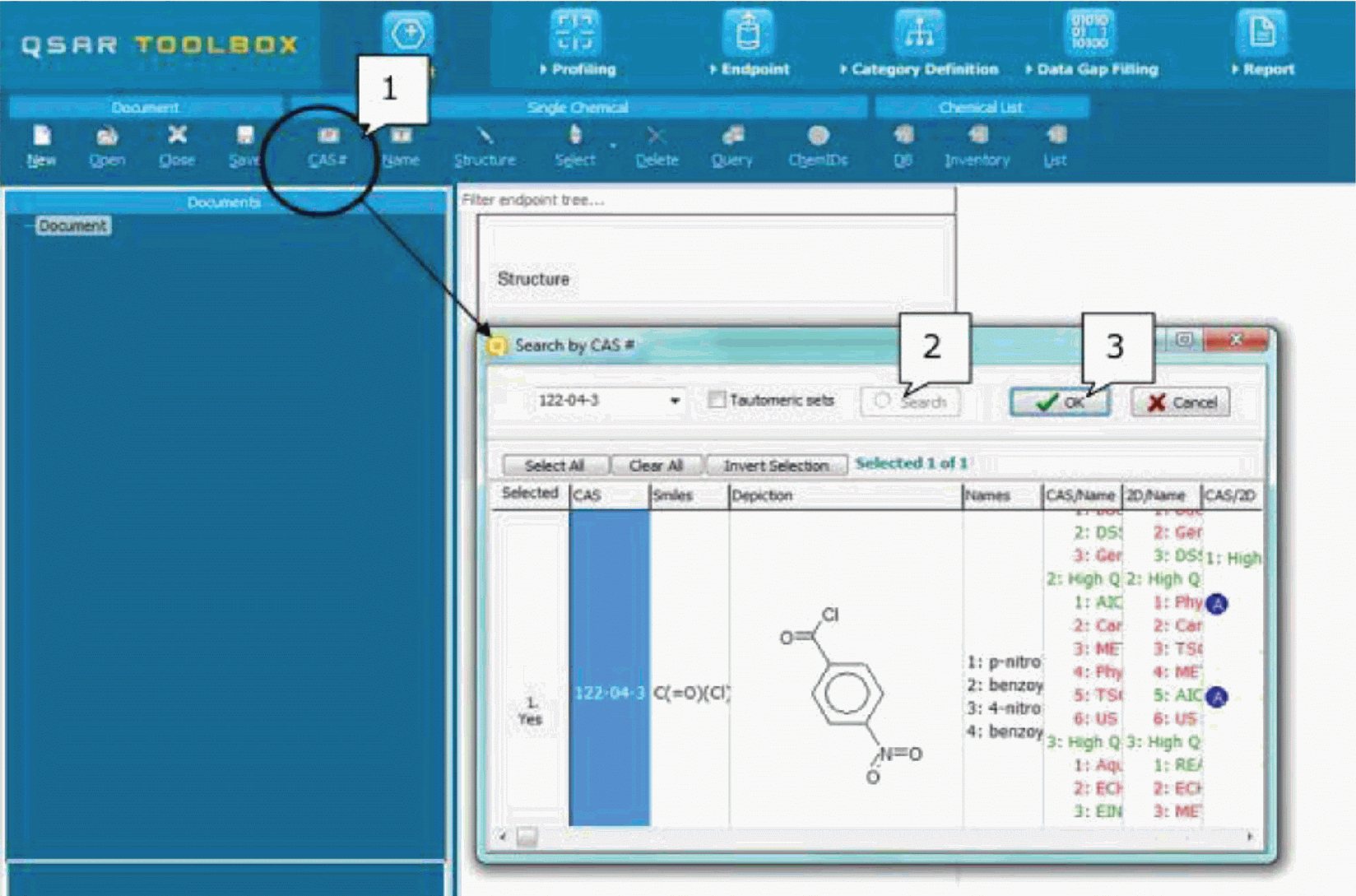 Пример - В начале работы необходимо нажать на кнопку "CAS #" 1, ввести номер CAS 4-нитробензоилхлорида (CAS N 122-04-3), нажать на кнопку "Search" ("Поиск") 2 и после появления правильной химической структуры нажать на кнопку "OK" ("Принять") 3 во всплывающем окне (рисунок 2).