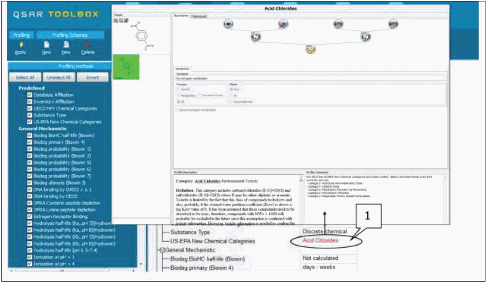 Модуль "Профилирование" позволяет получить информацию путем осуществления выборки из массива данных по определенному критерию на основе идентификации вещества или его структуры. Панель инструментов программы в настоящее время содержит большой список "Профилей", которые идентифицируют принадлежность к ранее определенным категориям (например, категории, определенные US-EPA <*> для оценки новых химических веществ, или категории, оцененные в рамках программы ОЭСР по химическим веществам с высоким объемом производства), а также механизмам или принципам действий. Сводную информацию можно получить, выбрав название профиля