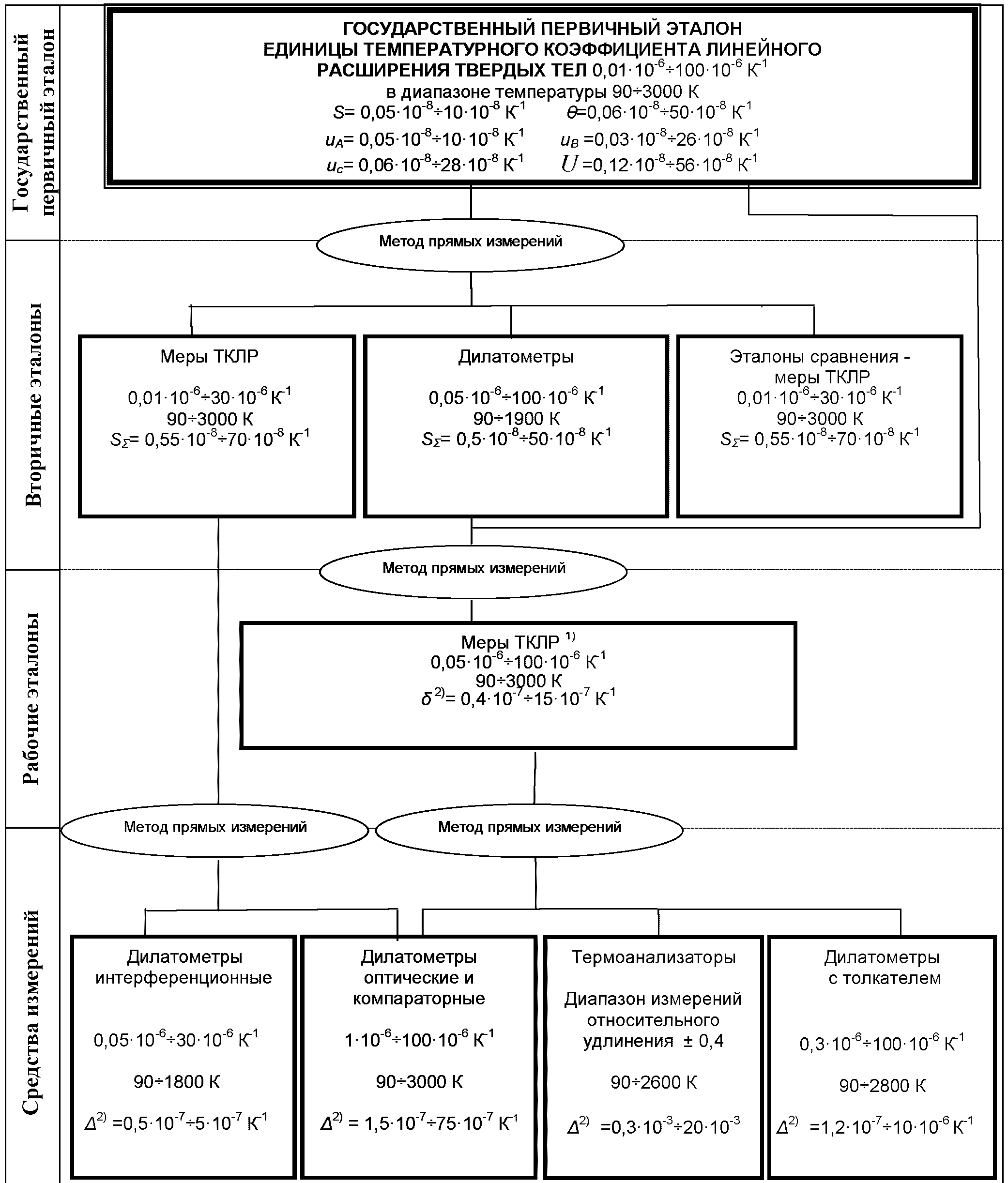 Государственная поверочная схема для средств измерений температурного коэффициента линейного расширения (далее - ТКЛР) твердых тел в диапазоне от 0,01·10-6 до 100·10-6 К-1 в диапазоне температуры от 90 до 3000 К устанавливает порядок передачи единицы ТКЛР твердых тел от государственного первичного эталона, при помощи вторичных и рабочих эталонов, средствам измерений с указанием погрешностей и основных методов передачи единицы.