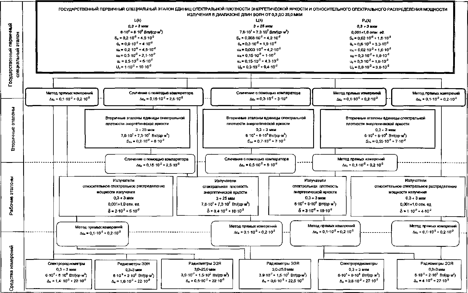 3) и относительного спектрального распределения мощности излучения - относительные единицы, от государственного первичного специального эталона (ГПСЭ) непосредственно и с помощью вторичных эталонов и рабочих эталонов средствам измерений с указанием методов поверки. Возможность непосредственной передачи единицы величины СПЭЯ от ГПСЭ средствам измерений обеспечивает более высокую точность передачи по сравнению со схемой