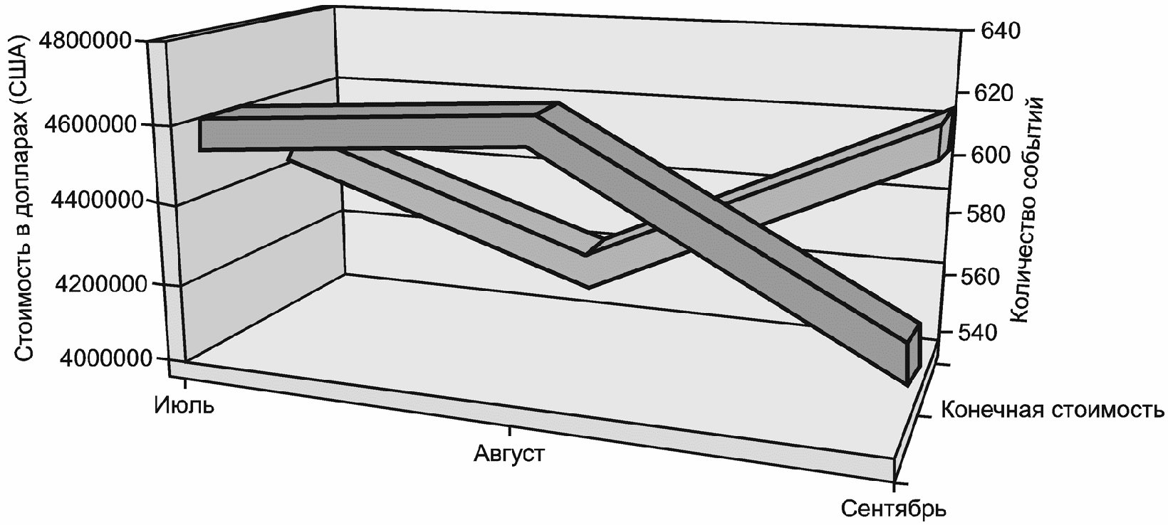 На данную диаграмму нанесены два индикатора. Первый отражает количество опасных событий, а второй их стоимость. Наблюдая за динамикой данных индикаторов, становится ясно, что во втором отчетном периоде количество событий доходит до максимальной величины, а затем начинает уменьшаться. В то же время стоимость была минимальна, а затем начала повышаться. Рассмотрение этих двух индикаторов по отдельности не позволило бы нам увидеть общую картину подверженности организации риску.