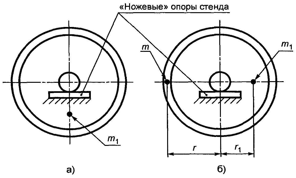 Остаточный статический дисбаланс проверяют установкой опорных шеек технологических осей (колеса или колесного центра) или буксовых шеек колесной пары на горизонтальные "ножевые" опоры балансировочного стенда. При самопроизвольной остановке колеса, колесного центра или колесной пары на "ножевых" опорах стенда радиус-вектор дисбаланса центра масс m1 направлен вниз (рисунок А.1, а).