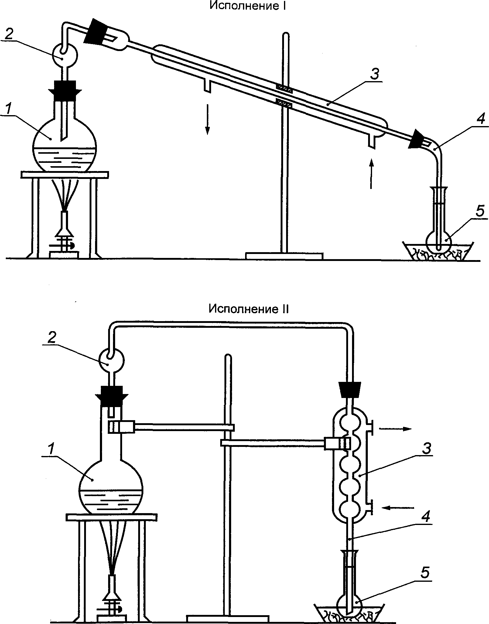 Установка лабораторная для перегонки этилового спирта (исполнение I или II), состоящая из перегонной (плоскодонной или круглодонной) колбы 1, соединенной через каплеуловитель 2 с зашлифованной нижней частью холодильника 3. Допускается использовать колбу, закрывающуюся резиновой пробкой с отверстием, в которое вмонтирован каплеуловитель с оплавленным концом. Холодильник соединен с приемной колбой 5 стеклянной трубкой 4 с вытянутым узким концом, который должен доходить почти до дна приемной колбы, но не касаться его (рисунок 1).