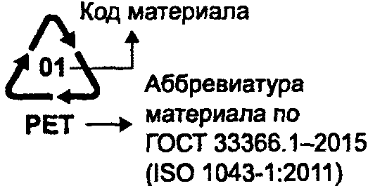 Код идентификации полимерного материала - цифровое обозначение материала. Идентификационный код пластмассы, являющийся международным кодом, применяют для обозначения материала, из которого изготовлено изделие, и упрощения процедуры сортировки изделия перед отправкой на переработку для вторичного использования. Цифру, обозначающую код идентификации пластмассы, помещают внутри петли Мебиуса (треугольника), а под треугольником размещают аббревиатуру, обозначающую тип пластмассы в соответствии с таблицей А.1 и ГОСТ 33366.1.