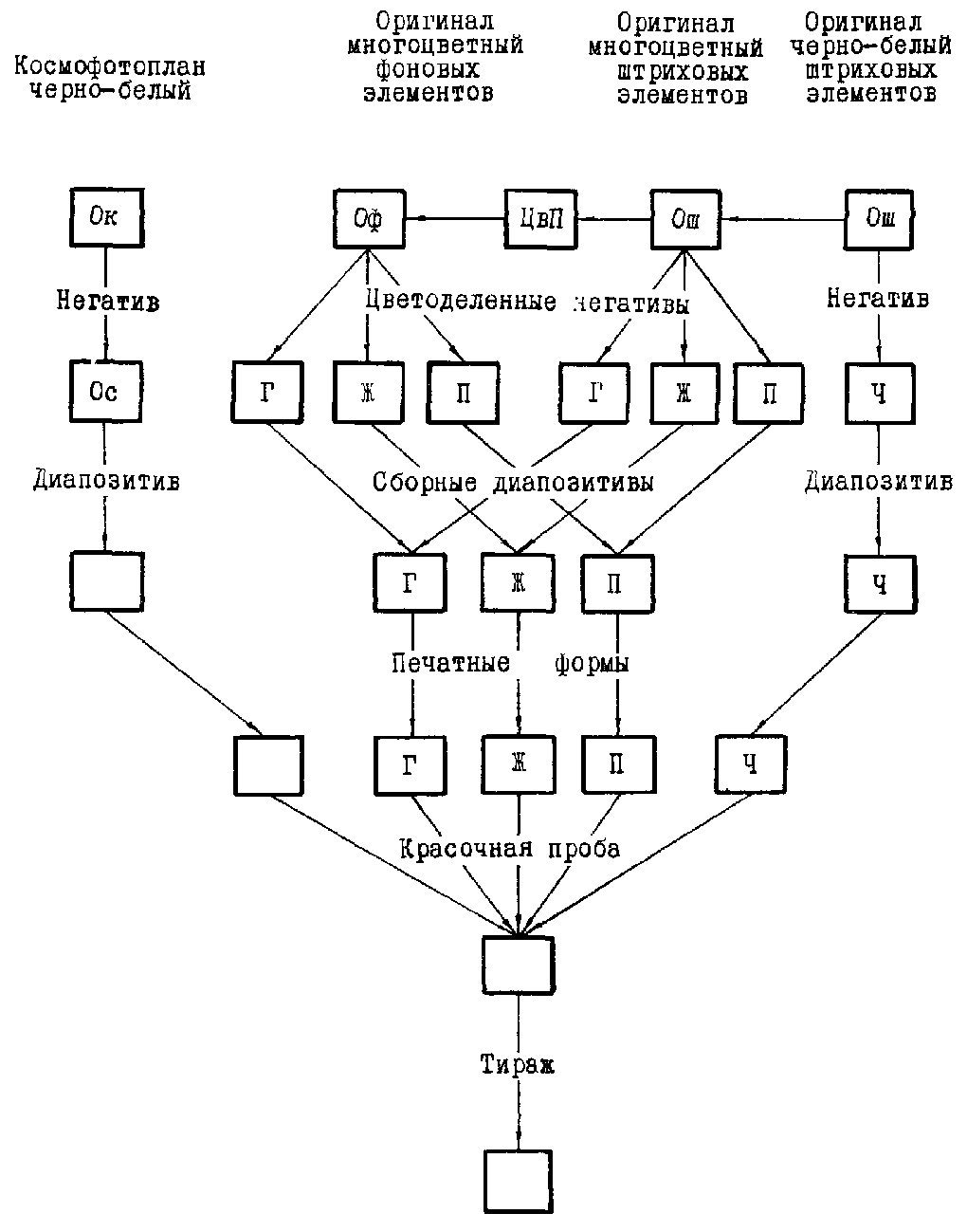 Такое строгое разделение элементов необходимо, когда все штриховые элементы, которые на карте должны быть цветными, будут воспроизводиться, как и фоновая окраска карты, стандартной триадой печатных красок (голубого, желтого и пурпурного цветов). Для сложных космофотокарт, имеющих тонкие штриховые обозначения (горизонтали и т.п.) в период воспроизведения изготавливают пятый или шестой диапозитивы для штриховых красок в зависимости от содержания и оформления штриховой нагрузки космофотокарты.
