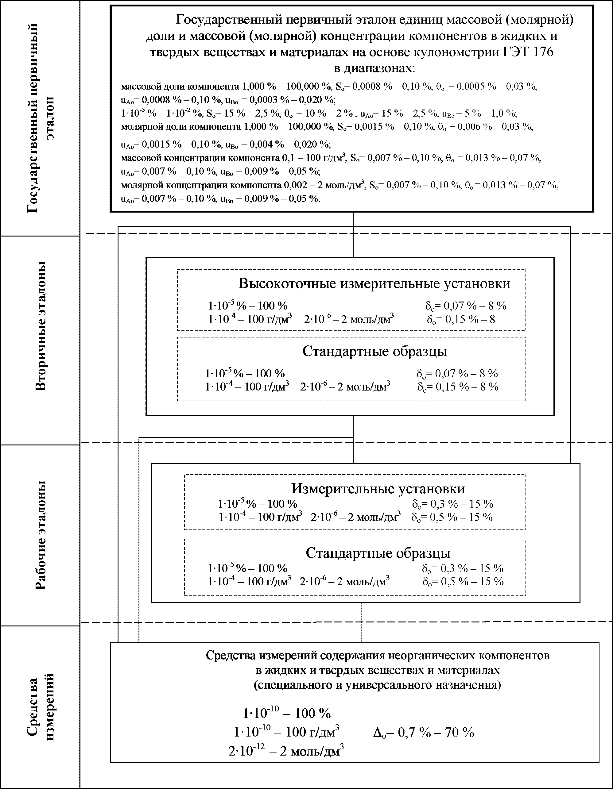 Государственная поверочная схема распространяется на государственный первичный эталон единиц массовой (молярной) доли и массовой (молярной) концентрации компонентов в жидких и твердых веществах и материалах на основе кулонометрии ГЭТ 176 (далее - государственный первичный эталон ГЭТ 176) и устанавливает порядок передачи единиц <1> массовой (молярной) доли компонентов, %, массовой (молярной) концентрации компонентов, г/дм3 (моль/дм3) от государственного первичного эталона вторичным и рабочим эталонам, а также средствам измерений содержания неорганических компонентов <2> в жидких и твердых веществах и материалах с указанием методов передачи единиц и показателей точности эталонов и средств измерений.