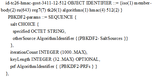3) keyLength - размер ключа в байтах; размер ключа в рамках схемы PBES2 может отсутствовать, так как всегда равен 32; в рамках схемы PBMAC1 он должен быть равен 32 и должен всегда присутствовать, так как функция HMAC_GOSTR3411 имеет переменный размер ключа;