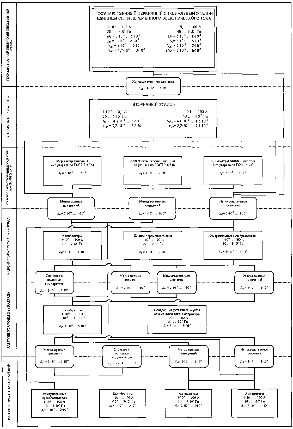 Государственная поверочная схема для средств измерений силы переменного электрического тока от 1·10-8 до 100 А в диапазоне частот от 1·10-1 до 1·106 Гц устанавливает порядок передачи единицы силы переменного электрического тока от государственного первичного специального эталона с помощью вторичного эталона и рабочих эталонов (далее - РЭ) рабочим средствам измерений с указанием погрешностей и основных методов поверки.