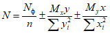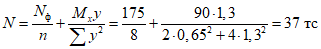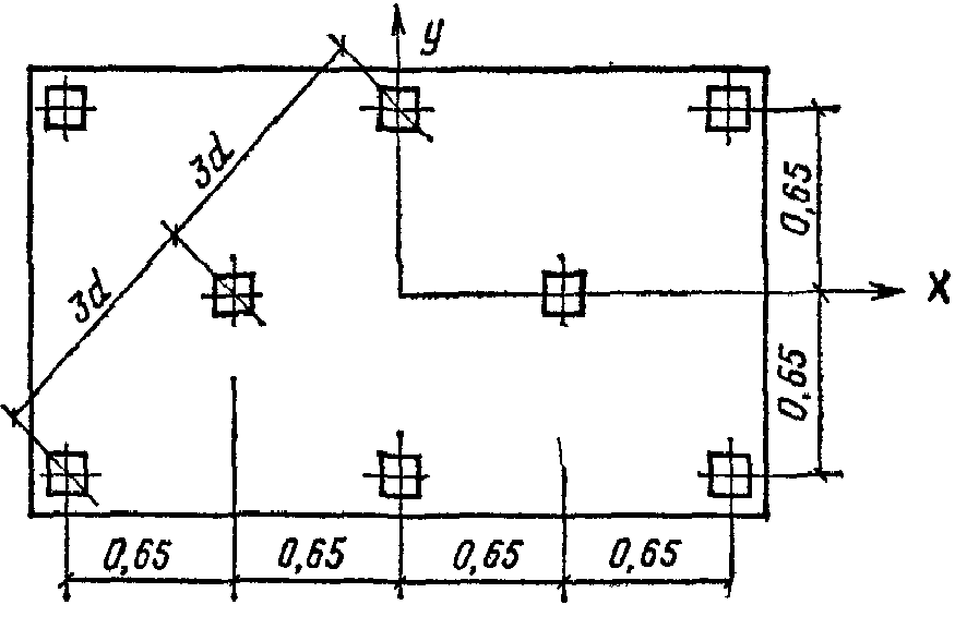 Пример. Требуется определить продольную N и поперечную H нагрузки и момент M, действующие в месте сопряжения с ростверком на каждую сваю, при следующих расчетных значениях внешних нагрузок на фундамент, приведенных к точке, расположенной в уровне подошвы ростверка на вертикальной оси симметрии фундамента: