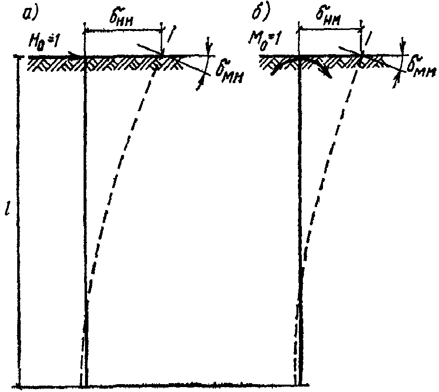 21 (13)] этого приложения определяем перемещения сваи в уровне поверхности грунта от единичных усилий, приложенных в том же уровне: