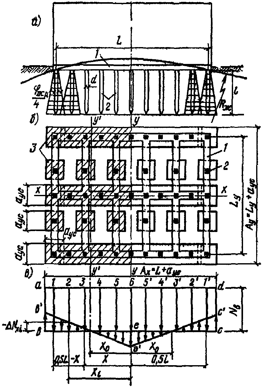 . Плоская расчетная схема фундамента и грунтовые условия показаны на рис. 5, а; план расположения свай в уровне подошвы ростверка приведен на рис. 5, б. Сваи железобетонные сечением 35 x 35 см; жесткости их поперечного сечения при сжатии и изгибе соответственно равны: