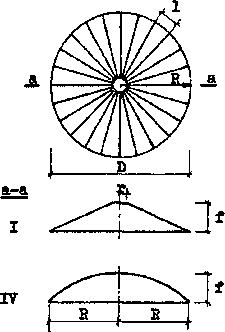 2) на круглом (или многоугольном) плане. Утепленные трапециевидные панели покрытия укладываются по радиально расположенным ребрам купола. Опорный контур рекомендуется многоугольным (по числу ребер) для исключения местного изгиба при передаче распоров ребер. Рекомендуемые диаметры - до 60 м при стреле подъема